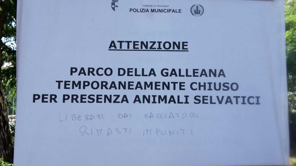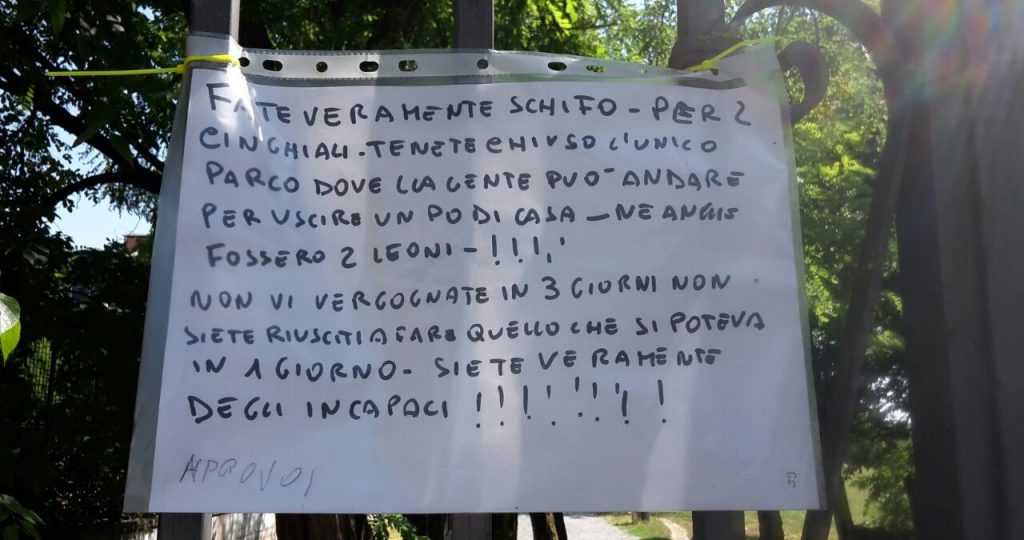 Qualche concittadino pare meno disposto alle giustificazioni, almeno è ciò che emerge leggendo alcuni cartelli comparsi sui cancelli d’ingresso del parco: “Fate veramente schifo, per due cinghiali tenete chiuso l’unico parco dove la gente può andare per uscire un po’ di casa, neanche fossero due leoni. Non vi vergognate?”. Altri cartelli apparsi in questi giorni hanno un sapore più ecologista e ideologico: “Parco temporaneamente chiuso per la presenza di animali selvatici liberati dai cacciatori rimasti impuniti”.