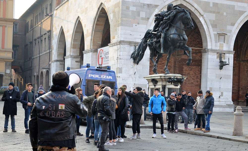 “Aldo libero!”. Il sindacato Si Cobas in piazza Cavalli per chiedere il rilascio dal carcere del segretario nazionale Aldo Milani, arrestato nei giorni scorsi con l’accusa di estorsione, sospettato di aver chiesto denaro a un’azienda di Modena per interrompere picchetti e manifestazioni. La questura della città modenese ha diffuso anche un video dove si vede un altro uomo, seduto accanto a Milani, intascare una busta da un dirigente, poi, subito dopo, il blitz della polizia. Un video che secondo i militanti dimostra al contrario l’innocenza di Milani, il quale, proprio nel pomeriggio, è stato rimesso in libertà.