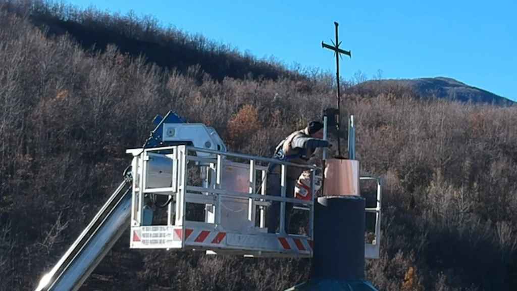 I tecnici sono saliti a recuperare la croce originale. Una volta a terra è stata sistemata e preparata alla nuova installazione.