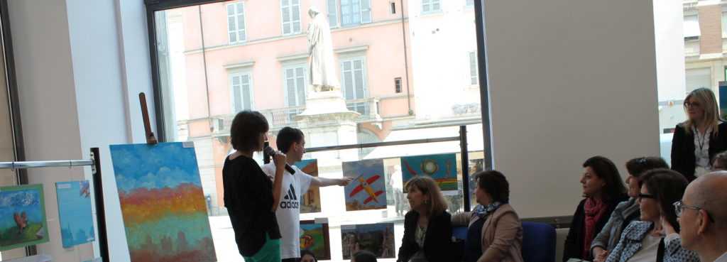 Al momento dell’inaugurazione della mostra, grande emozione quando Beppe, uno dei ragazzi dell’Associazione Famiglie Giovani Svantaggiati A.FA.GI.S, dopo aver ascoltato da una docente l’importanza educativa del progetto ha mostrato con il dito ai presenti il suo quadro.