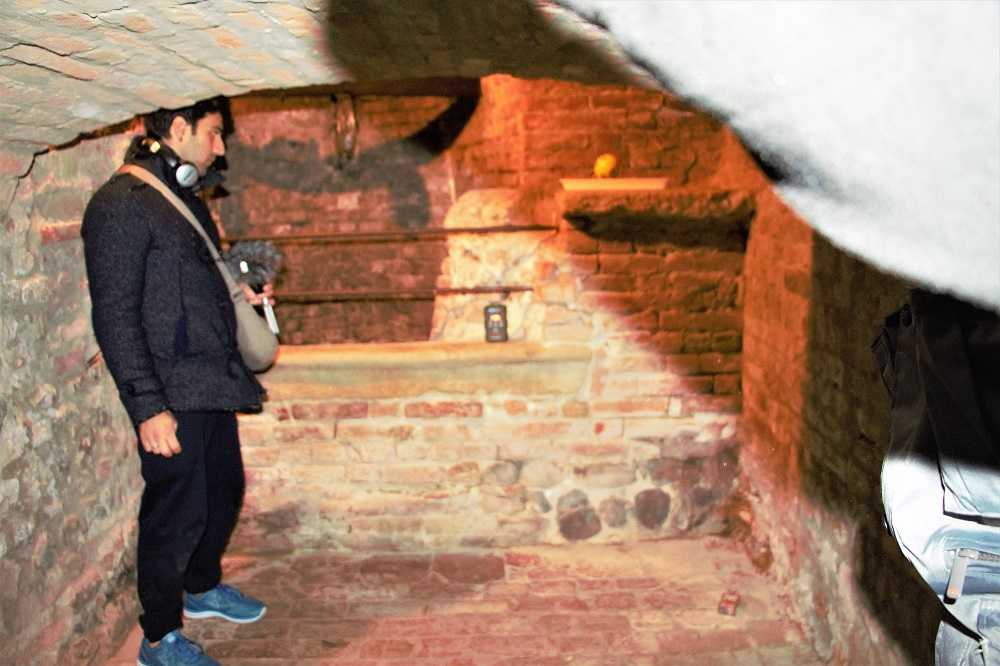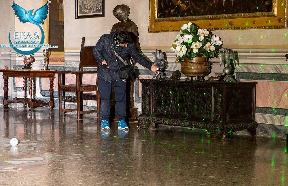 I ricercatori si sono divisi in due squadre organizzate in modo tale da poter coprire l’intera area: particolare attenzione è stata rivolta al famoso pozzo dell’acqua, all’altezza del quale pare sia stato ucciso dal maggiordomo, in un impeto di rabbia e gelosia, il celebre cuoco Giuseppe il cui corpo venne poi ritrovato all’interno della sua amata cucina. Accanto alla sua statua, che campeggia proprio in prossimità del pozzo, è stata rilevata un’anomalia degna di nota: di fianco all’effige, infatti, è stata immortalata da uno dei nostri operatori, in uno scatto fotografico, un’ombra anomala. Ombra attentamente studiata, filtrata e scansionata anche grazie all’ausilio di uno studio di analisi fotografiche di Roma: attraverso un sofisticato strumento chiamato spettrofotometro, gli esperti (estranei ad E.P.A.S.) hanno escluso qualsiasi contraffazione, definendo il fenomeno singolare e difficilmente spiegabile sotto il profilo tecnico. Inoltre, in quello stesso punto, quattro ricercatori hanno avvertito vertigini e spossatezza. Infine, strumentazioni e batterie appena caricate e dotate di un’autonomia di diverse ore, hanno subito cali di tensione e improvvise perdite di energia. Qualsiasi fenomeno può essere spiegato con motivazioni razionali e logiche (suggestione e campi magnetici naturali) ma la concomitanza di questi eventi risulta comunque atipica. A ciò vanno aggiunti picchi elettromagnetici, odori provenienti da fonti non definite e sbalzi termici, il tutto registrato dalle strumentazioni in dotazione ai tecnici di E.P.A.S. In particolare, nel corso dell’indagine, la temperatura ha subito marcate oscillazioni passando, in un’occasione, da 10 a 2 gradi in meno di 15 minuti per poi ritornare oltre i 10 gradi.