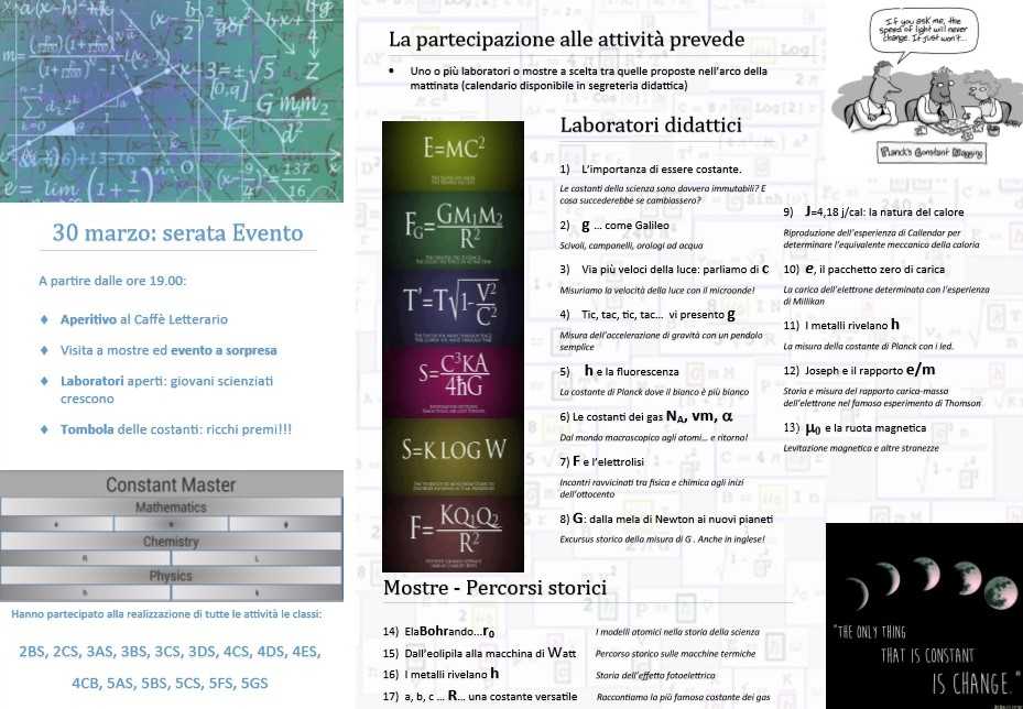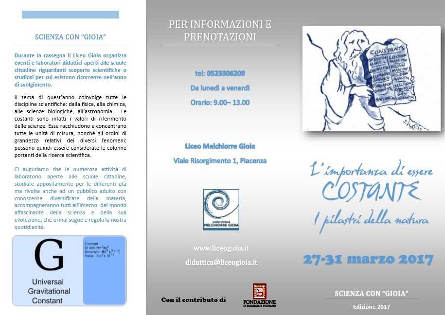 Anche nell’anno scolastico 2016-17, il Liceo Gioia organizzerà attività laboratoriali aperte alle scuole medie inferiori e superiori inerenti a temi scientifici nell’ambito del progetto “Scienza con Gioia”. Il tema di quest’anno, “L’importanza di essere costante: i pilastri della natura”, coinvolge tutte le discipline scientifiche: dalla fisica, alla chimica, alle scienze biologiche, all’astronomia. Le costanti sono infatti i valori di riferimento delle scienze. Esse racchiudono e concentrano tutte le unità di misura, nonché gli ordini di grandezza relativi dei diversi fenomeni: possono quindi essere considerate le colonne portanti della ricerca scientifica.